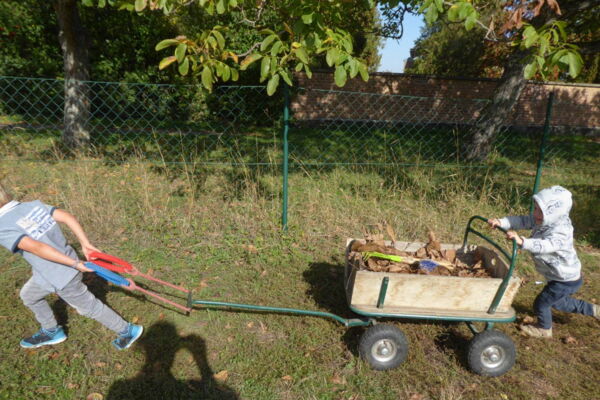 Unsere Bäume verlieren die Blätter und wir haben viel zu tun. Damit es schneller geht, nehmen wir zum Transport unseren Leiterwagen.