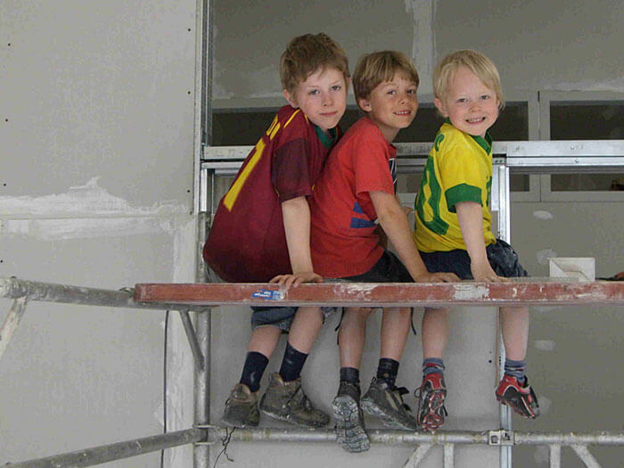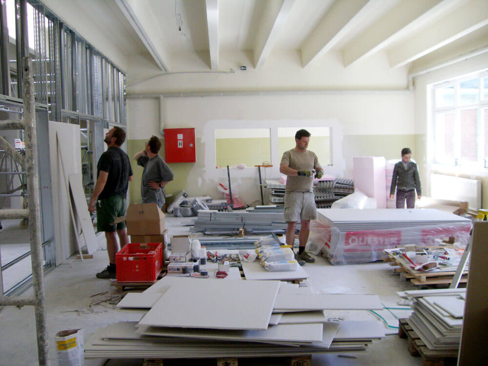 Es wurden wieder Finanzkonzepte und Zahlungspläne erstellt, die vom Schulerhalter jedoch, trotz mehrfacher Überarbeitungen, abgelehnt wurden. Der Vorstand hatte nämlich die Idee, die Schule in der HTL Mödling unterzubringen, die zum damaligen Zeitpunkt ein evangelischer Direktor leitete, und wo ein stark renovierungsbedürftiges Gebäude mit integrierter Schmiede und großzügigem Platzangebot leer stand. Die Verantwortlichen hatten das Potential des Engagements und der Eigeninitiative der Schule bei bereits stattgefundenen Renovierungsarbeiten erkannt und hofften, hier Synergien schaffen zu können. Bei dieser Idee wurde jedoch der Faktor „vorbereitete Umgebung“ im Sinne der Montessori-Pädagogik nicht berücksichtigt. Die Zeit drängte und trotz immer größerer finanzieller Verzichtserklärungen der Schule für den geplanten Umbau der Druckereimaschinenhalle konnte keine Einigung erzielt werden. Barbara schaffte es in dieser Angelegenheit – wieder einmal an einem Faschingsdienstag – alle wichtigen VertreterInnen der evangelischen Kirche an einen Tisch zu bringen. Die Schule konnte ihr Anliegen erneut vorbringen und erhielt nach intensiven Verhandlungen, organisatorischen Veränderungen und weiteren Gesprächen die ersehnte Zusage für den Umbau. Durch die organisatorischen Veränderungen wurde die Schule kurzfristig dem evangelischen Flüchtlingsdienst zugeordnet. Im Zuge einer Umstrukturierung innerhalb der evangelischen Kirche entstand die „Diakonie – Eine Welt“, in der die Schule bis heute als Teil der „Diakonie – Bildung“ untergebracht ist. Dadurch änderte sich auch viel für die Schule, denn es kehrte eine zuvor nicht gekannte Stabilität ein, die der Schule auch in schwierigeren Phasen existentielle Sicherheit und Rückhalt bietet. Die Ausbauarbeiten der Halle begannen schließlich 2006 und endeten 2009. In einem ersten Abschnitt wurde der Bereich PII und Werkraum fertiggestellt, im zweiten Abschnitt wurden die Toiletten, die Küche und der Bewegungsraum ausgebaut. Ohne das außergewöhnliche Engagement von Pädagog*innen, Eltern, Kindern, FreundInnen und UnterstützerInnen der ErLEBnisschule, wäre so ein Projekt wieder einmal nicht möglich gewesen.