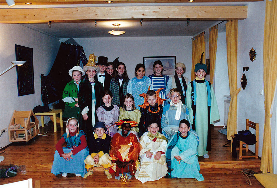 Sie waren als Eltern an der Schule und engagierten sich sehr stark. Ein Theaterprojekt mit dieser intensiven Vorbereitung und Professionalität hatte es in der Geschichte der Schule zuvor noch nicht gegeben. Für die zeitaufwendigen Proben wurden die Praxisräumlichkeiten von Karin Stöger genutzt. Die Uraufführung und gleichzeitig einzige Vorstellung des Stücks fand am 15. Dezember 2001 im Theater von St. Gabriel statt. Nach einem Höhepunkt geht es meistens ein wenig bergab und so auch nach diesem. Wieder einmal führten pädagogische Auffassungsunterschiede zu Konflikten, die damit endeten, dass ein Teil des Pädagogenteams die Schule verließ, um eine eigene Schule zu gründen. Zusätzlich musste bis zu Beginn des Schuljahrs 2002/03 dringend eine neue Bleibe gefunden werden. St. Gabriel bot – verbunden mit dem Zukunftsbild der Schule – ideale Rahmenbedingungen und es wurde konkret nach geeigneten Räumlichkeiten innerhalb des Klosters gesucht. Doch bis zur tatsächlichen Niederlassung war es noch ein anstrengender Weg.